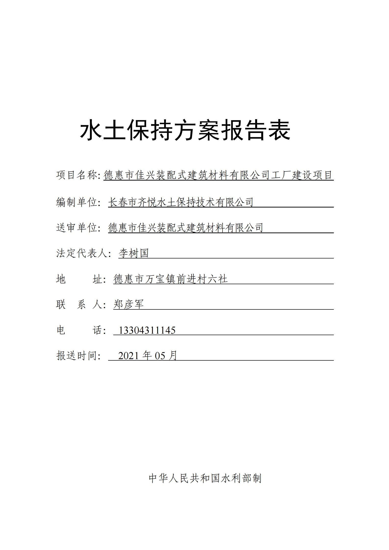 根据《吉林省水利厅关于进一步加强全省生产建设项目水土保持承诺制管理的通知》(吉水保函〔2021〕14号)对生产建设单位编制水土保持报告表的规定和要求,2021年5月,德惠市佳兴装配式建筑材料有限公司委托长春市齐悦水土保持技术有限公司编制了本项目的水土保持方案报告表。现将德惠市佳兴装配式建筑材料有限公司工厂建设项目在长春市齐悦水土保持技术有限公司http://www.changchunmaofeng.com网页予以公示。