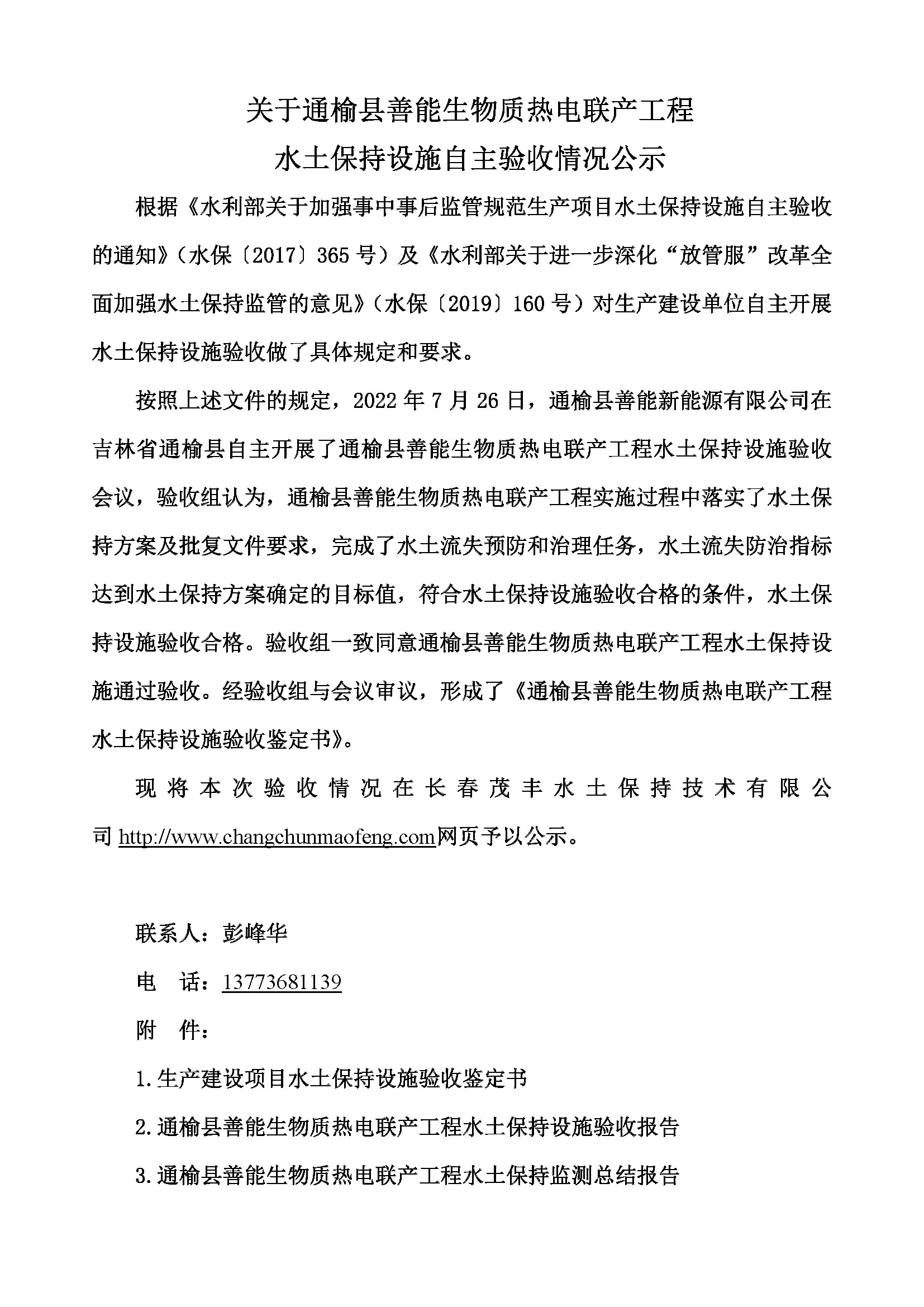 水土保持设施验收公示说明-通榆县善能生物质热电联产工程