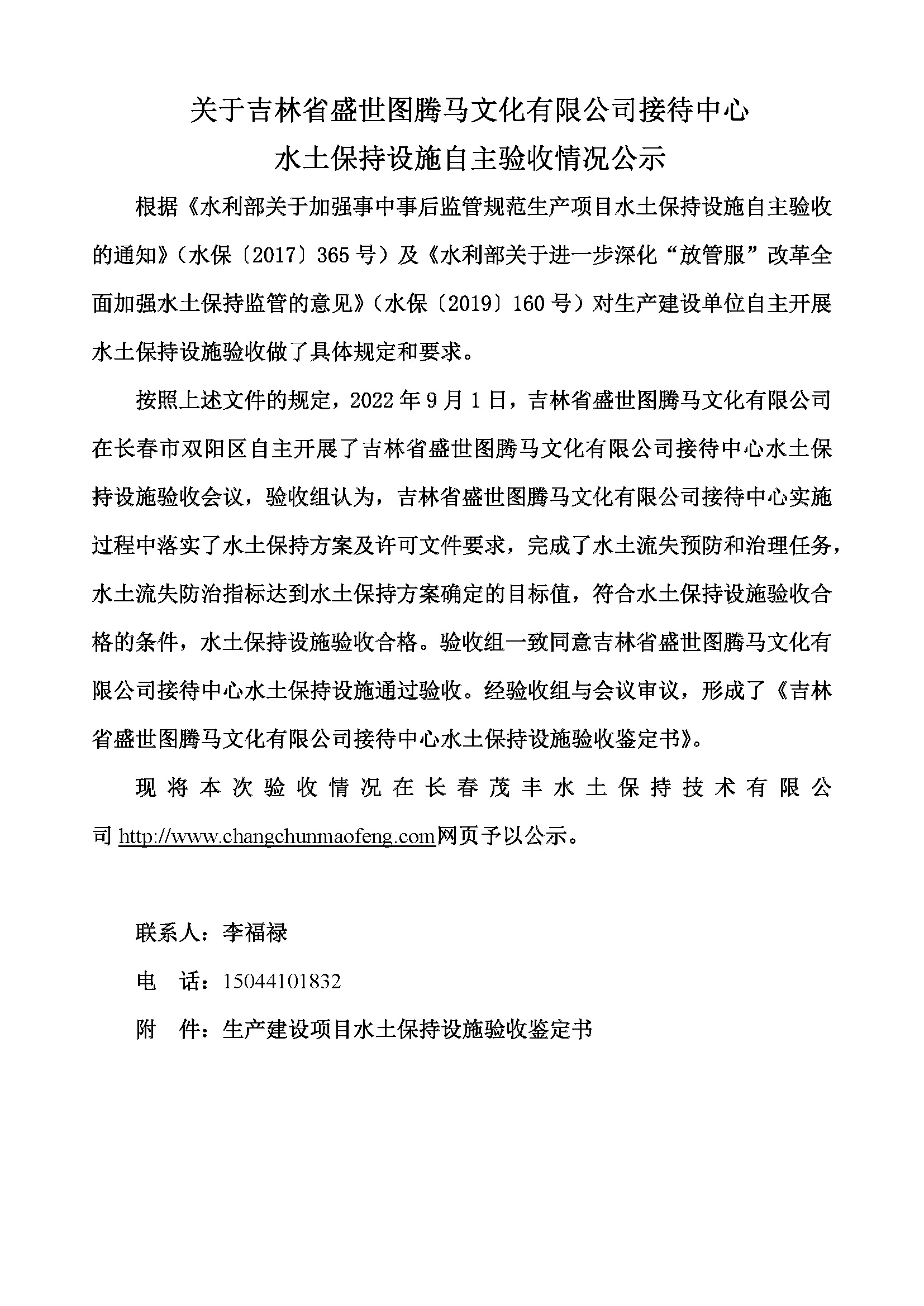 水土保持设施验收公示说明-吉林省盛世图腾马文化有限公司接待中心