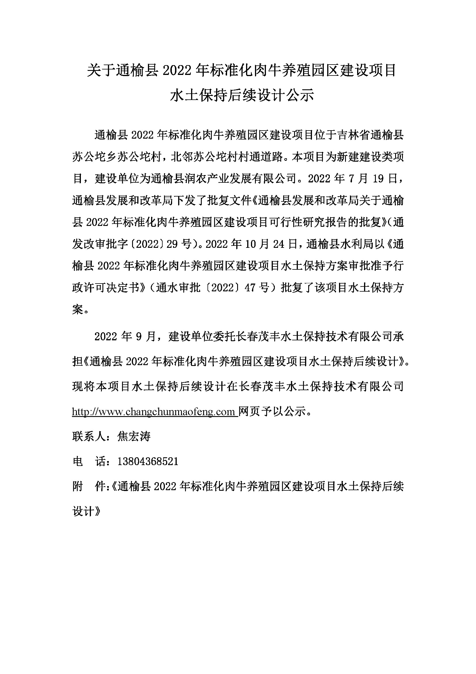 水土保持后续设计公示说明-通榆县2022年标准化肉牛养殖园区建设项目