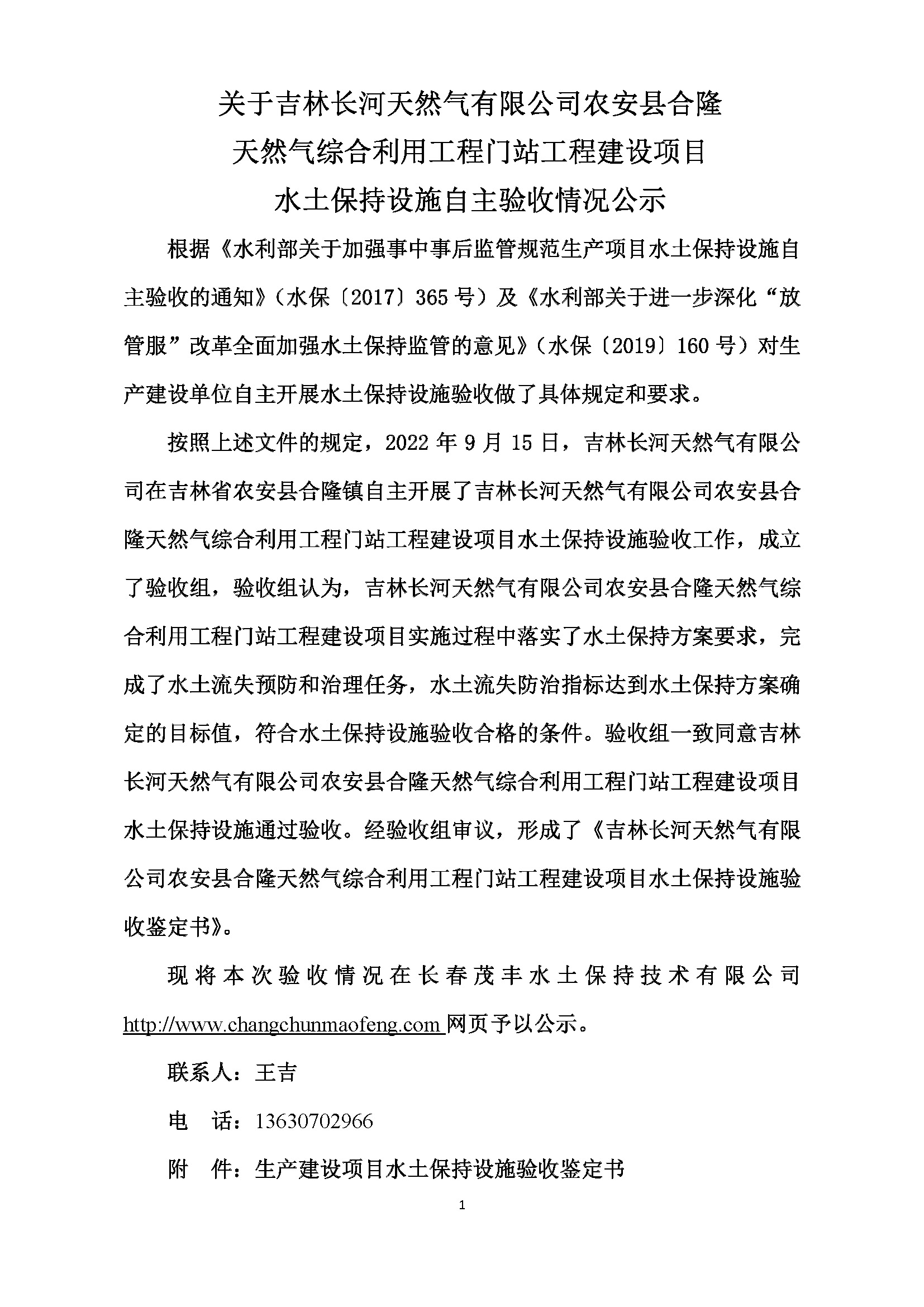 水土保持设施验收公示说明-吉林长河天然气有限公司农安县合隆天然气综合利用工程门站工程建设项目