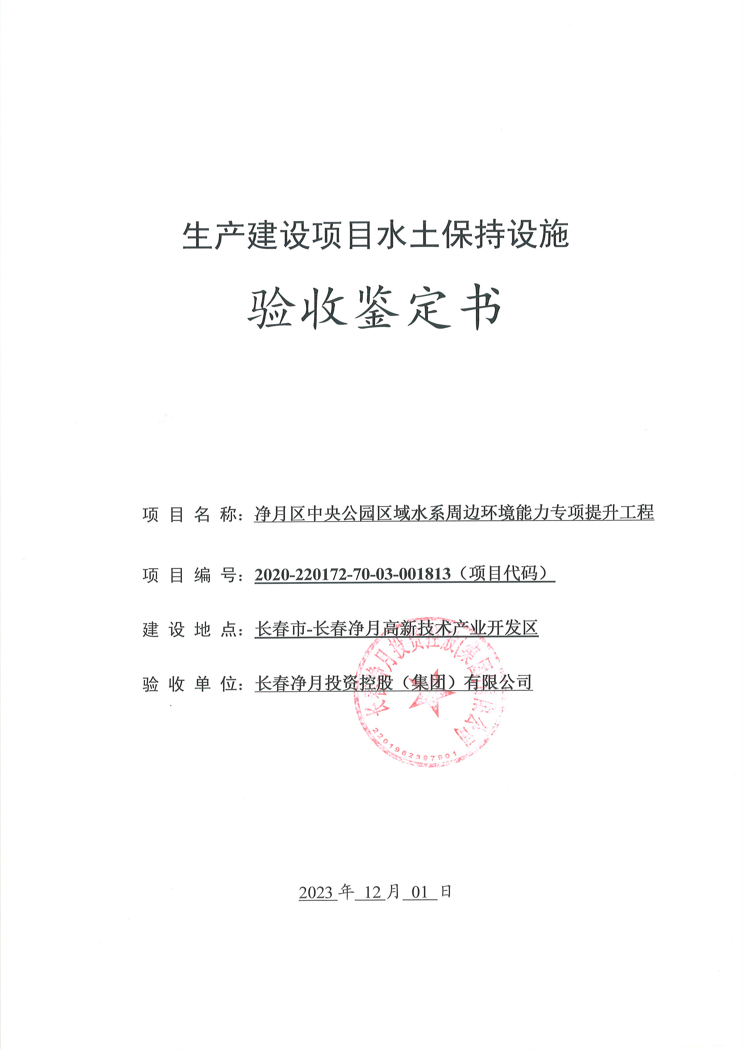 验收鉴定书-净月区中央公园区域水系周边环境能力专项提升工程